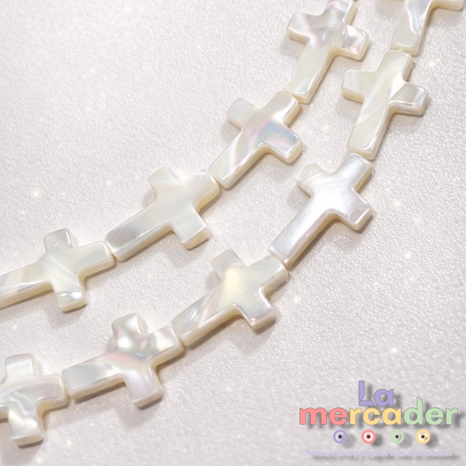 Cada pieza refleja la belleza orgánica de la madre perla, haciendo que ninguna cruz sea exactamente igual, lo que las convierte en un insumo especial y con carácter artesanal.