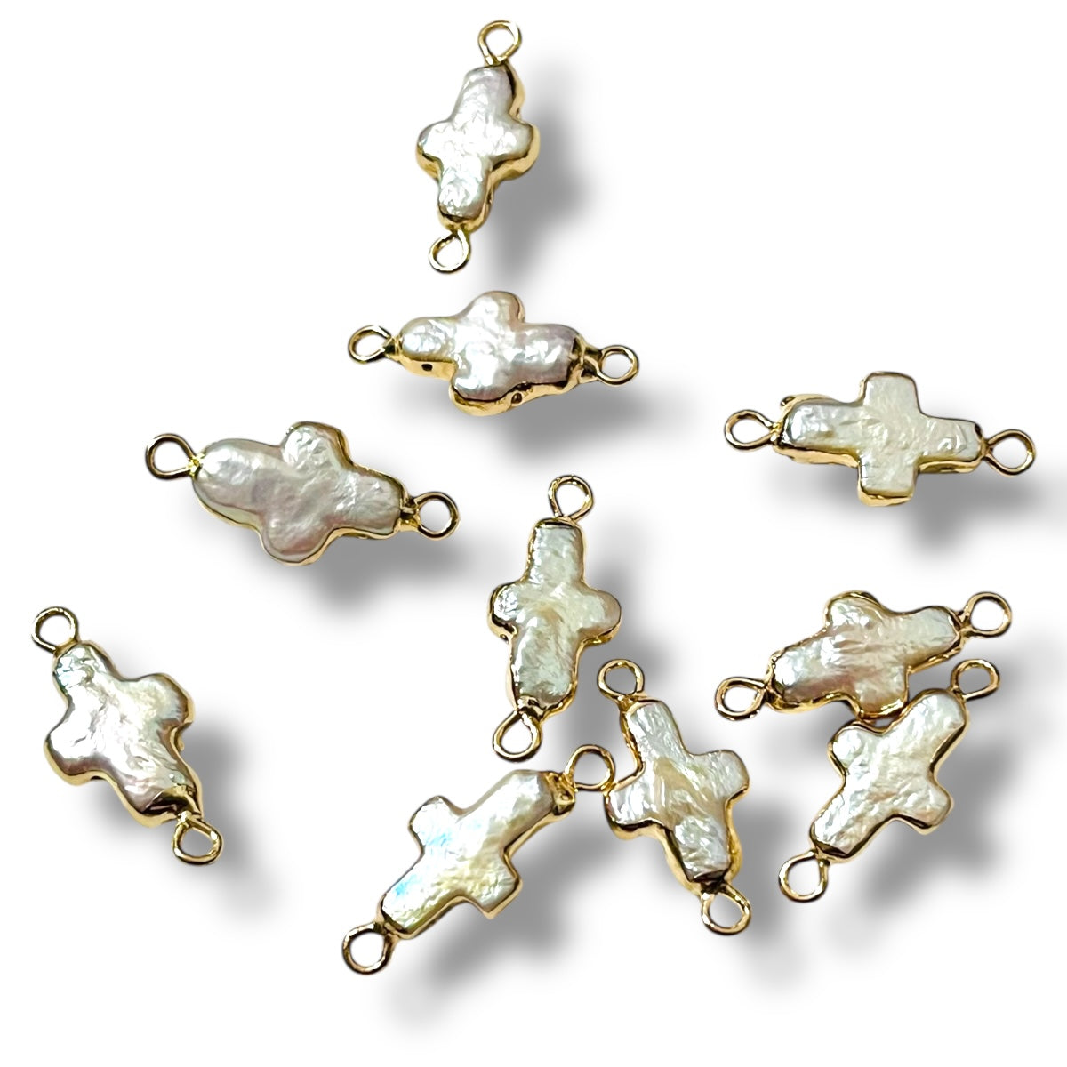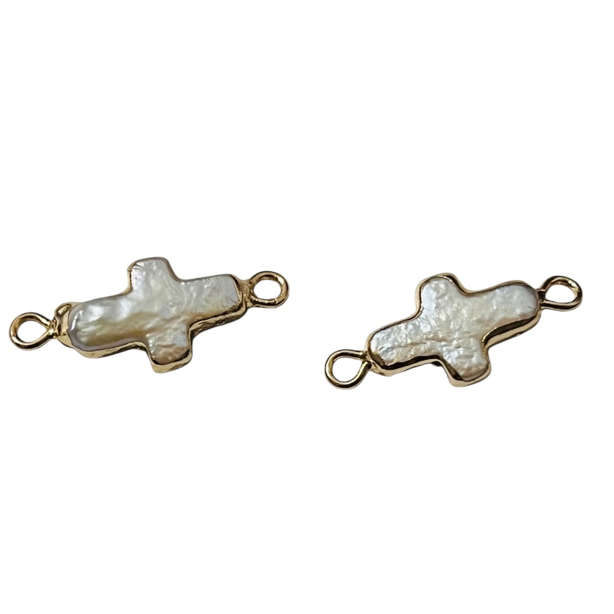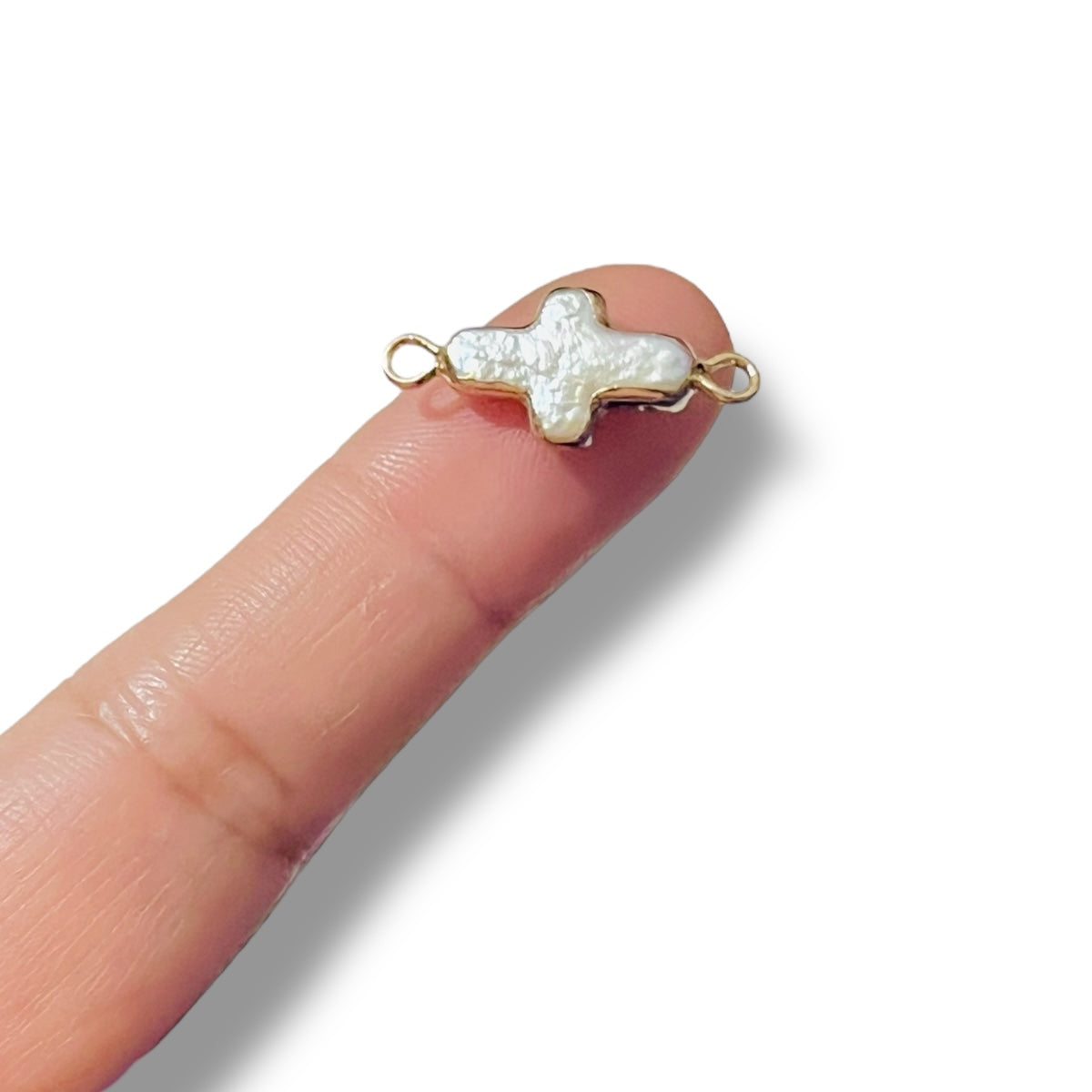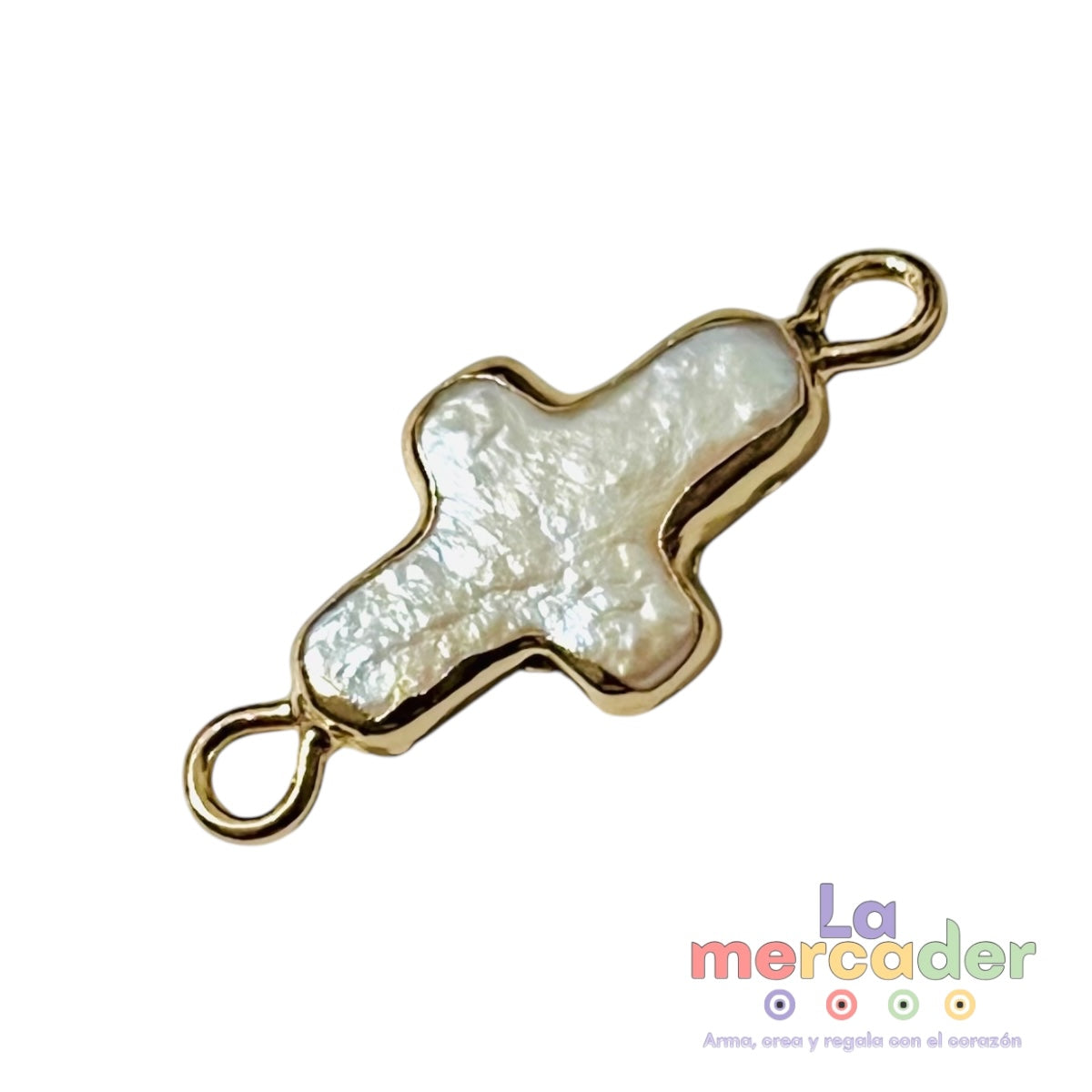 Este conector en forma de cruz está elaborado en nácar natural, montado en chapa de oro que resalta sus reflejos perlados. Mide 2.3 cm de largo y cuenta con argollas de 1.9 mm, listas para integrarse fácilmente en collares, pulseras o accesorios espirituales.