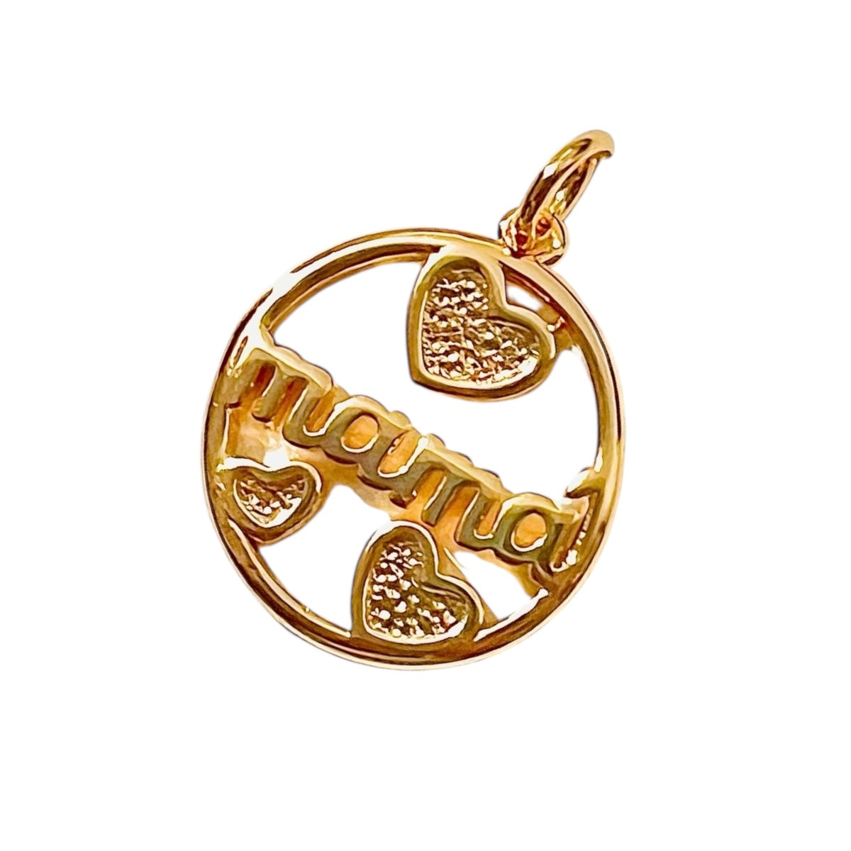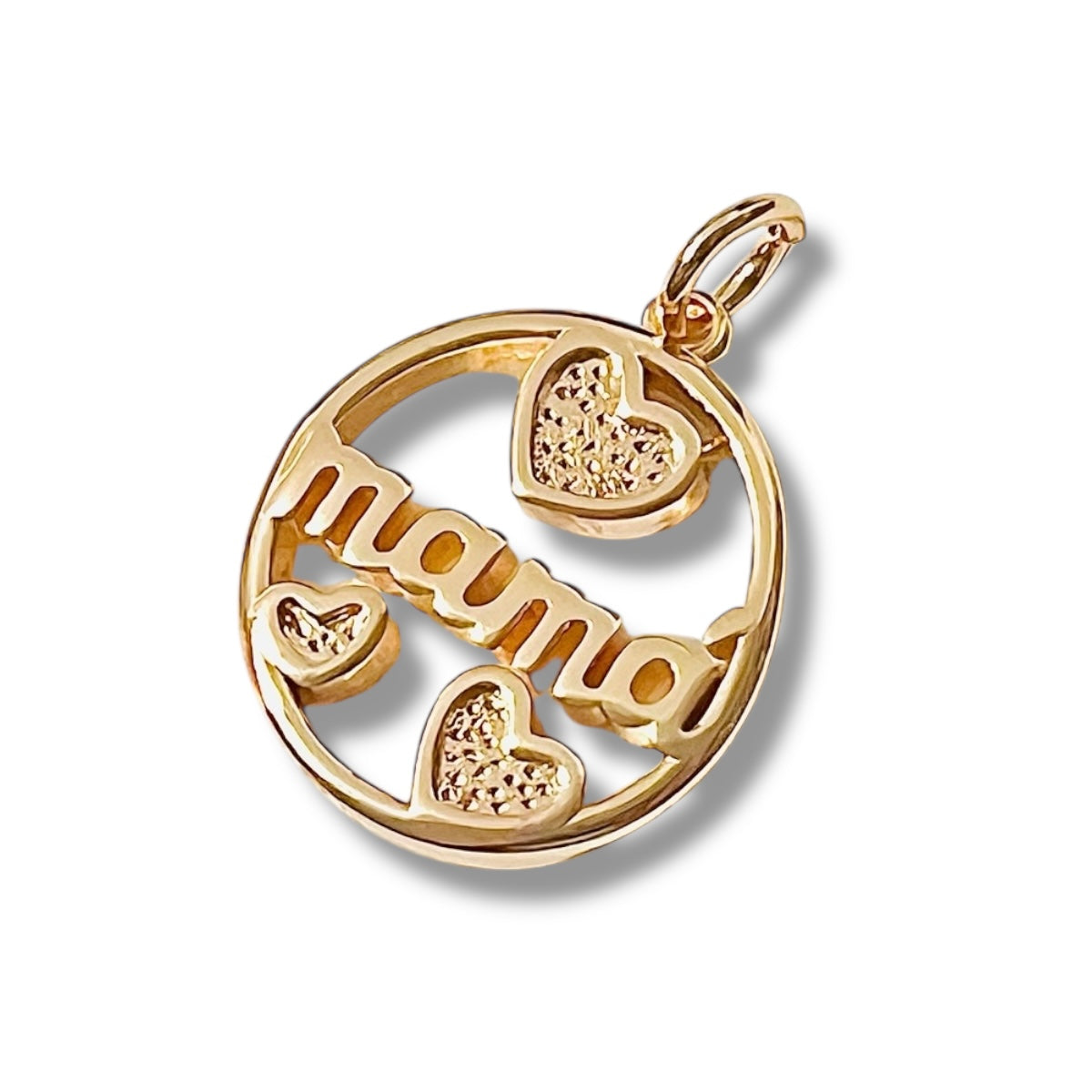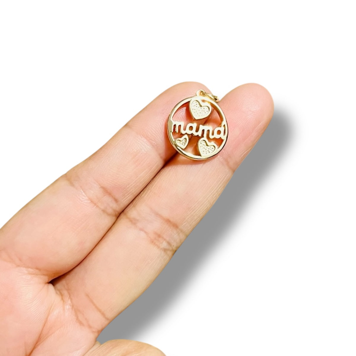 Dije redondo de chapa de oro, con la palabra “mamá” en el anverso y diseño texturizado en el reverso. Su acabado brillante y sus detalles en corazones lo convierten en una pieza ideal para proyectos personalizados.