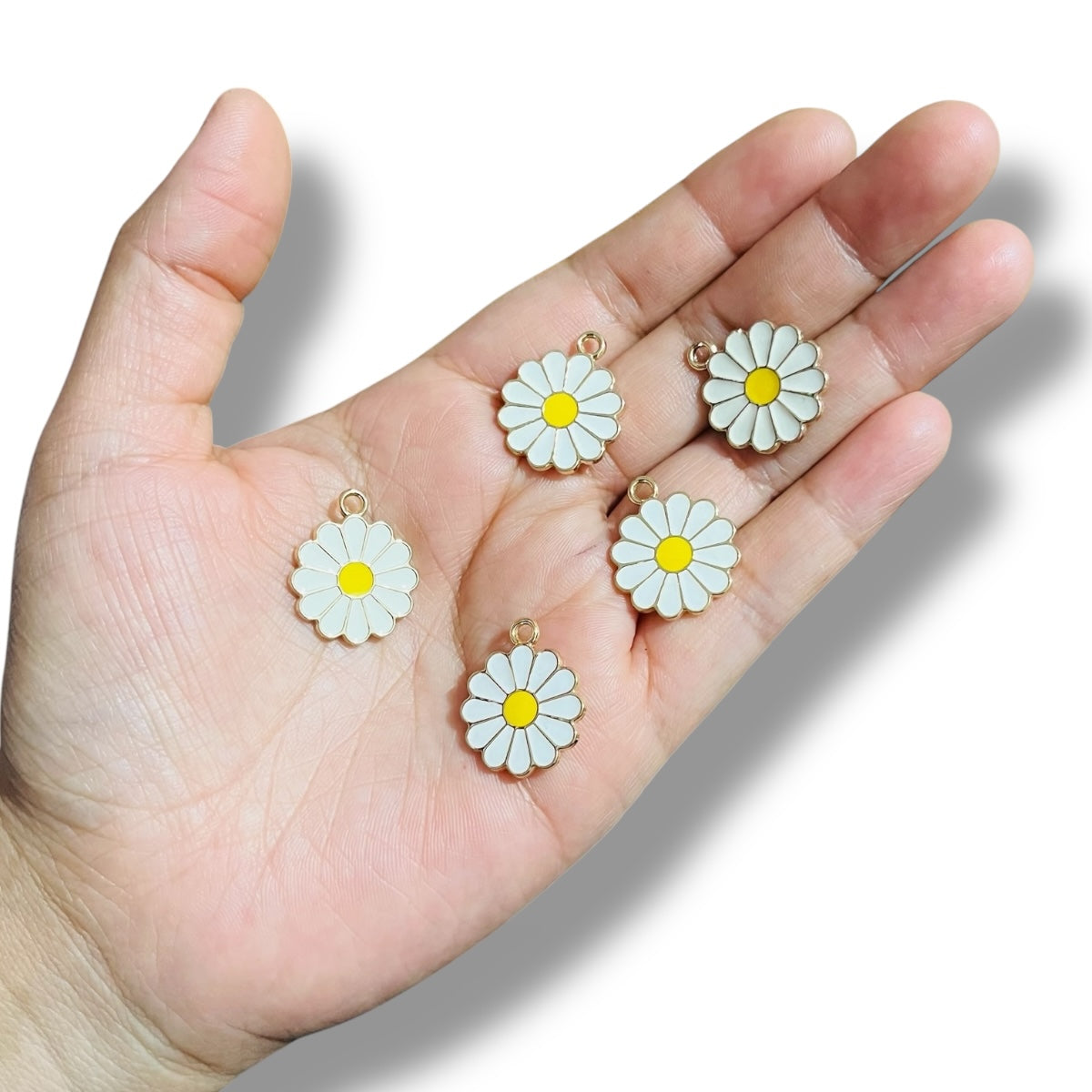 Este dije en forma de flor margarita esmaltada mide 2.1 cm y cuenta con una argolla de 2.2 mm de diámetro interno, lista para integrarse en collares, pulseras o aretes. Su diseño alegre con pétalos blancos y centro amarillo lo convierte en un detalle fresco, tierno y lleno de vida. 🌞