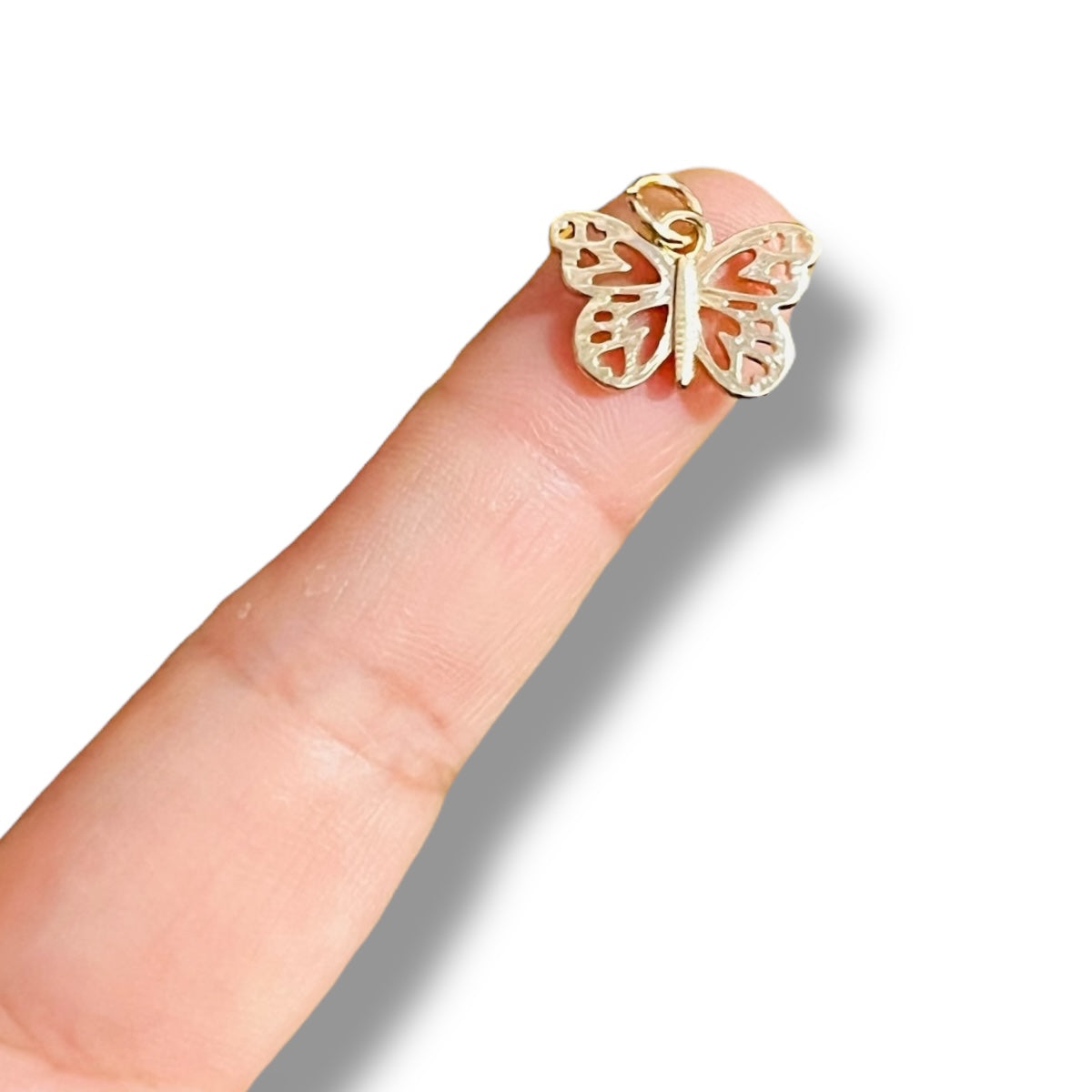 Este dije de mariposa en chapa de oro importada de 14k mide 1 cm y cuenta con una argolla de 3 mm de diámetro interno, lista para integrarse en tus accesorios favoritos. Su diseño calado y delicado lo convierte en un detalle lleno de luz y movimiento.