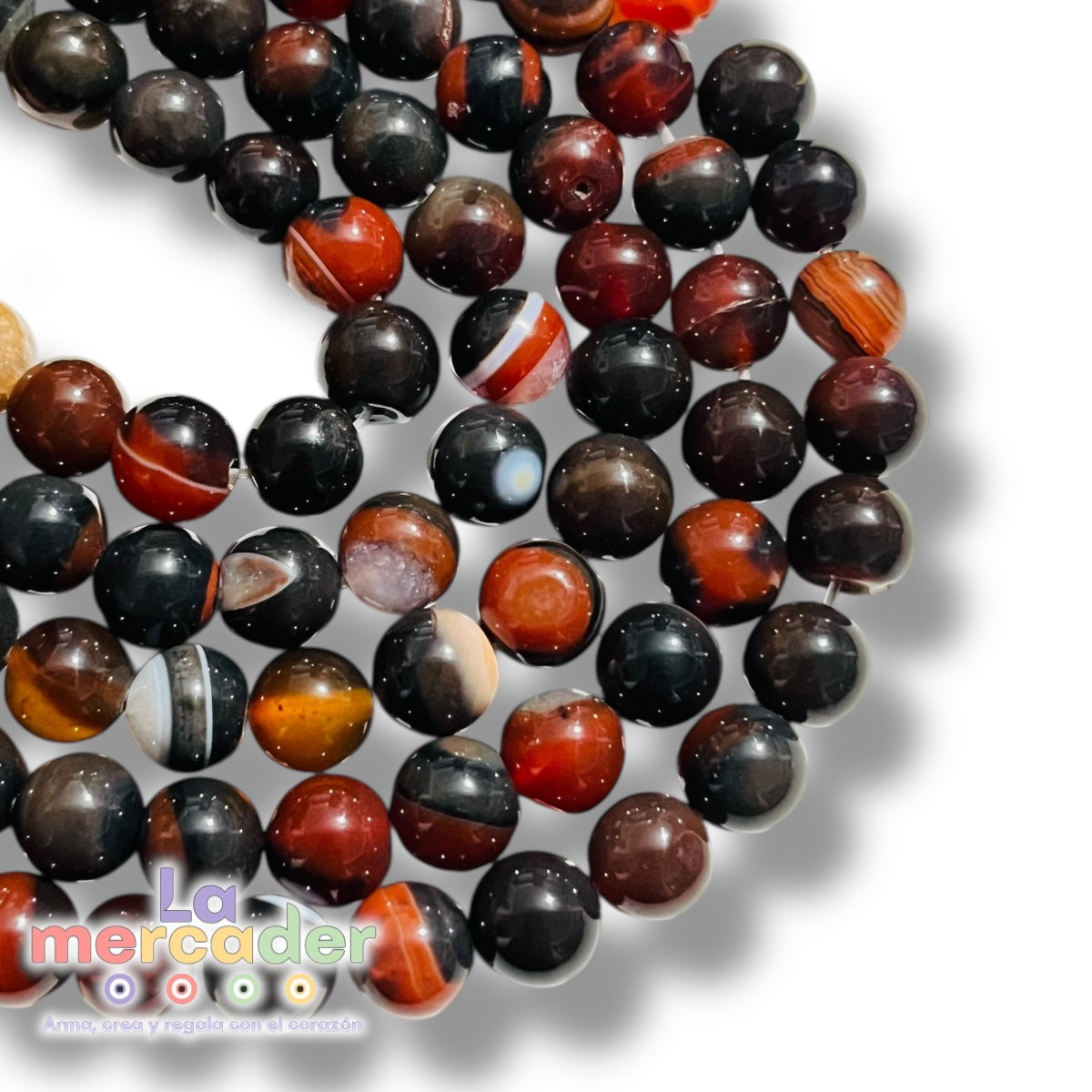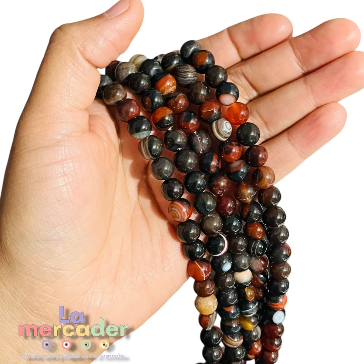 La Ágata Botswana Eclipse es una piedra natural que destaca por su mezcla profunda de tonos oscuros, rojizos, café y vetas claras, creando contrastes únicos en cada cuenta.