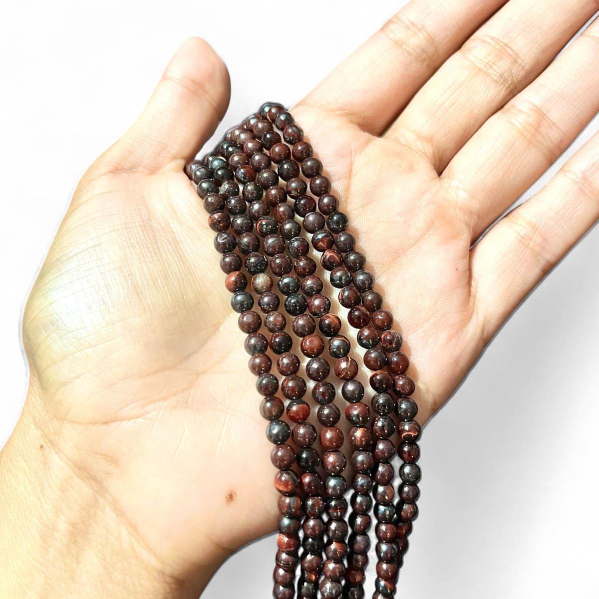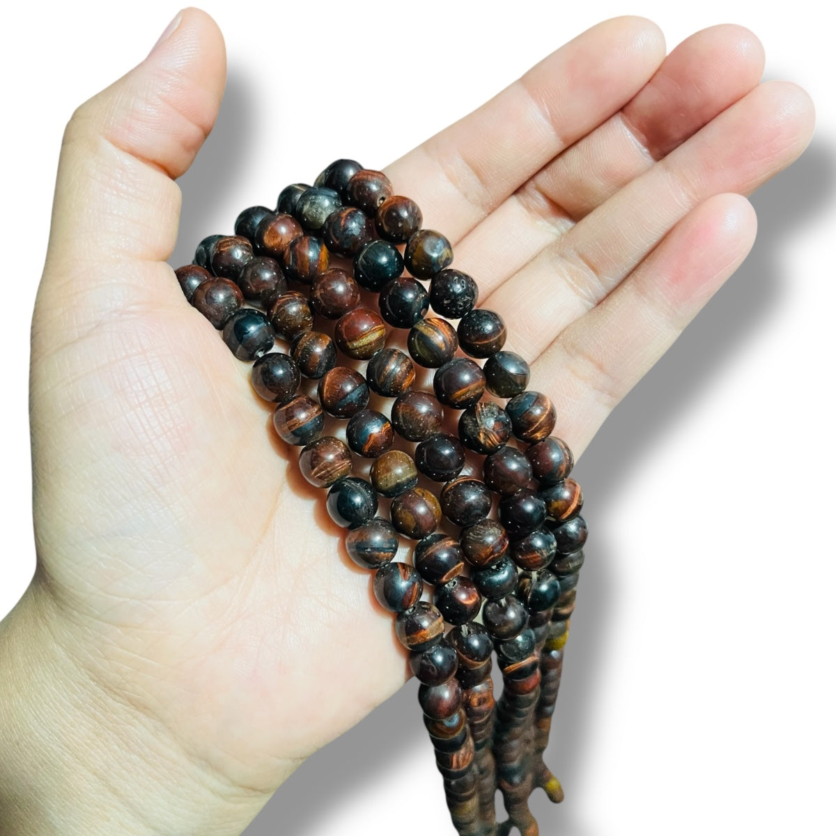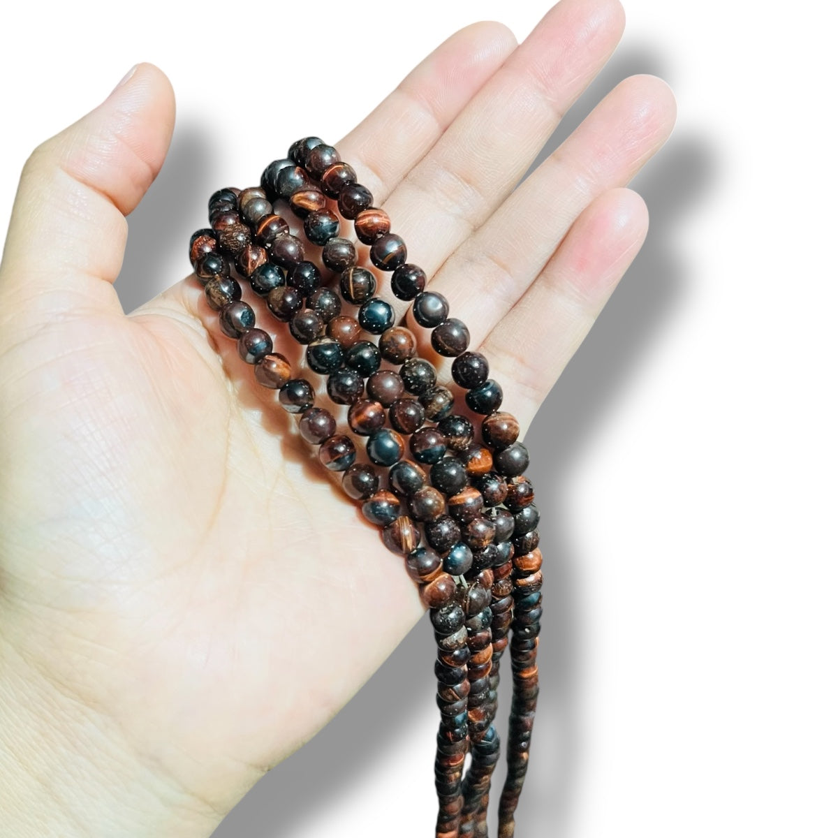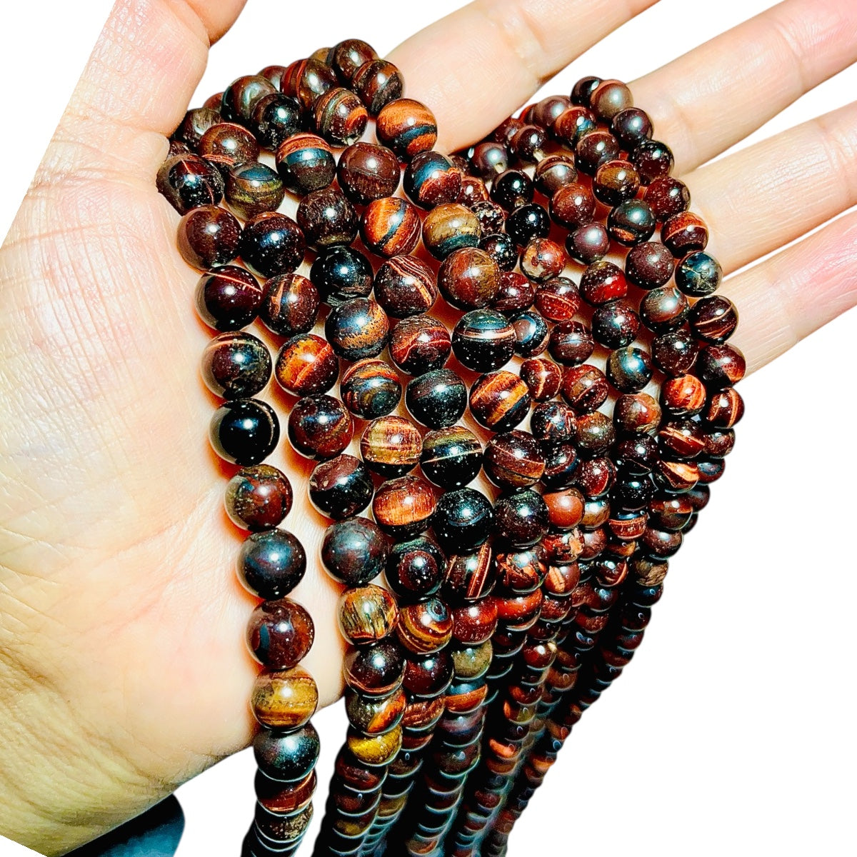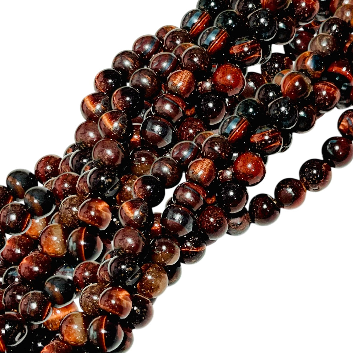 Cada cuenta muestra un brillo único con vetas rojizas y cobrizas que parecen moverse con la luz, perfectas para transmitir fuerza, energía y protección.