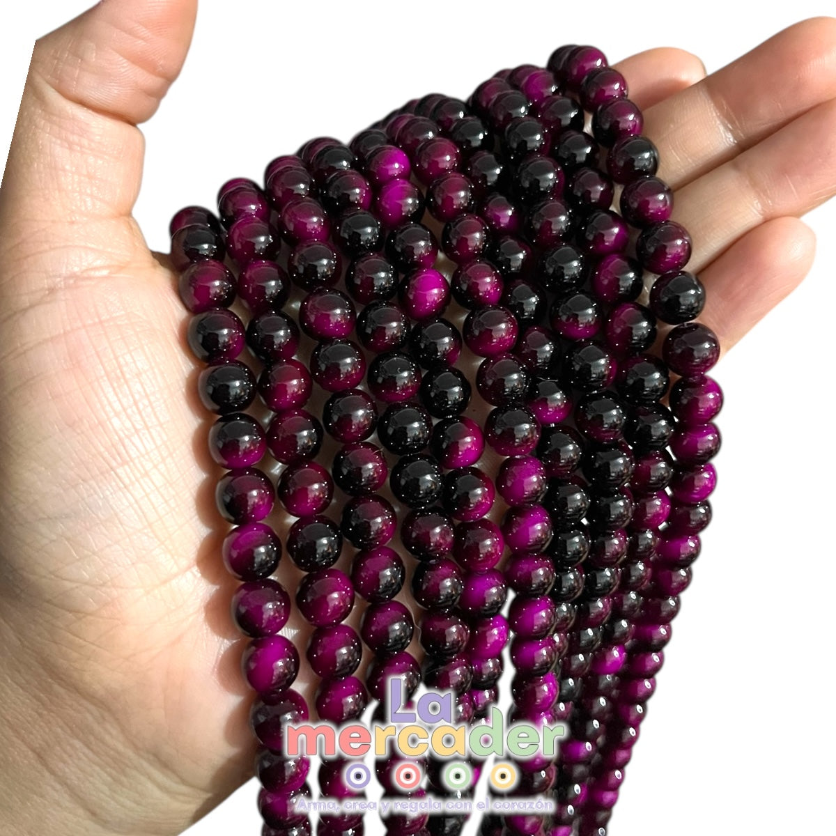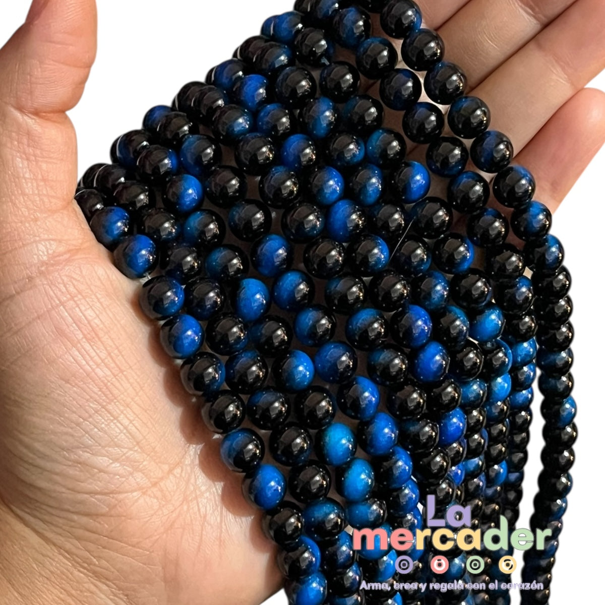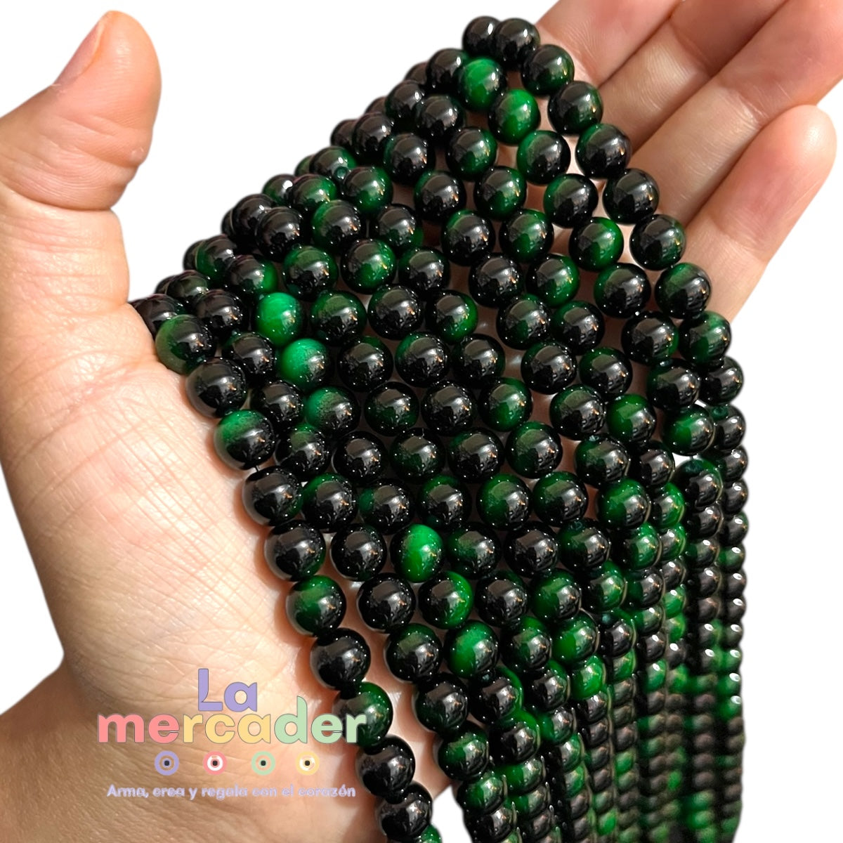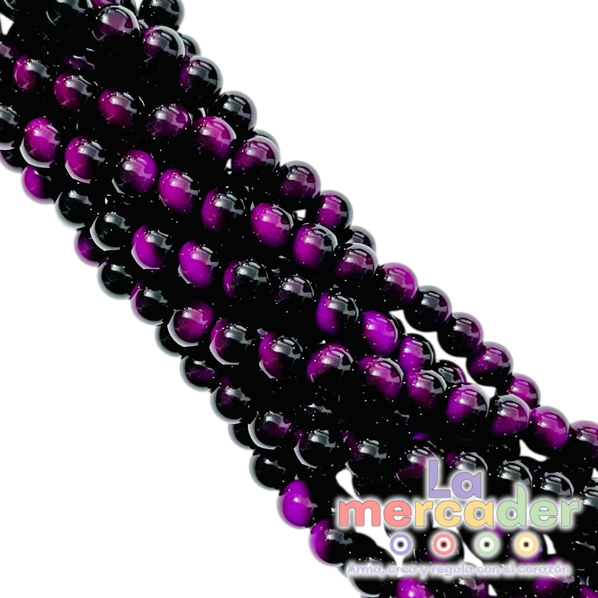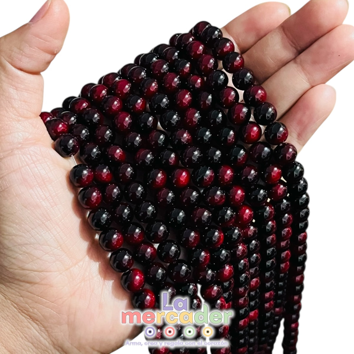 Cuentas redondas de 8 mm, elaboradas en vidrio de alta calidad. Sus colores vibrantes no se despintan, ya que el tono está integrado directamente en el material, lo que garantiza una apariencia brillante y duradera.