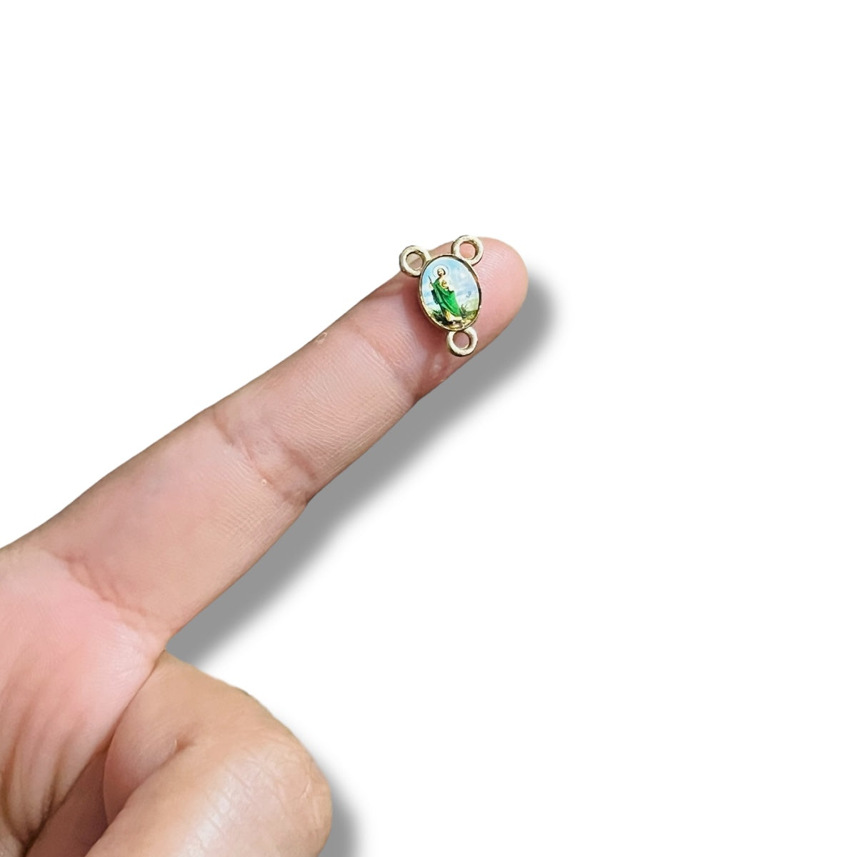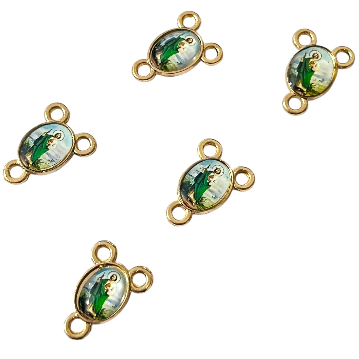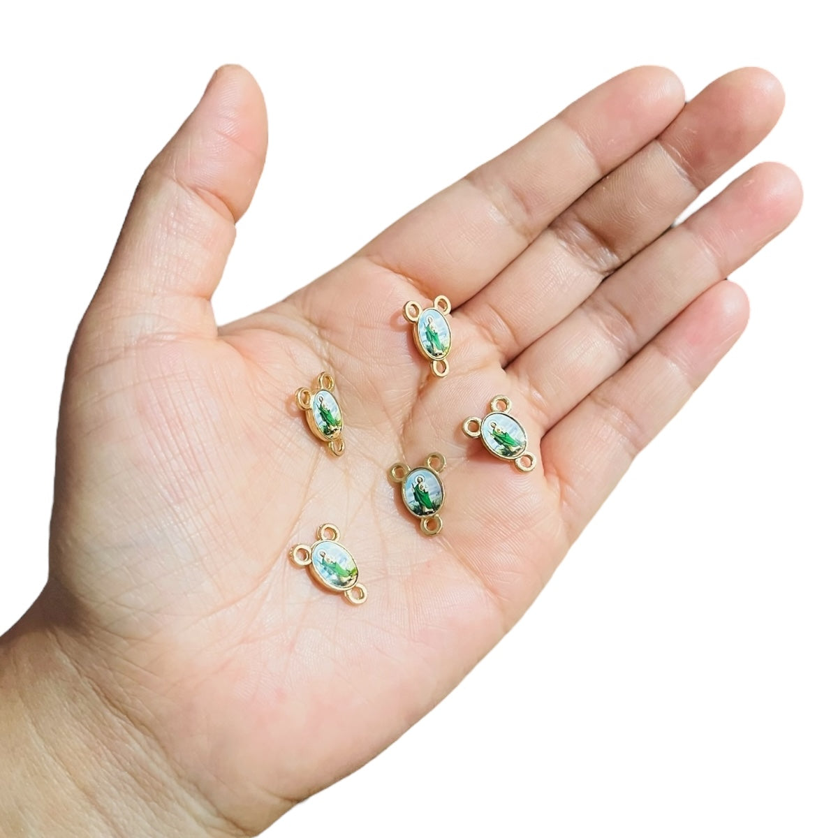 🔹 Diseño: Ovalado con tres puntos de conexión, práctico para ensartar en rosarios y accesorios religiosos