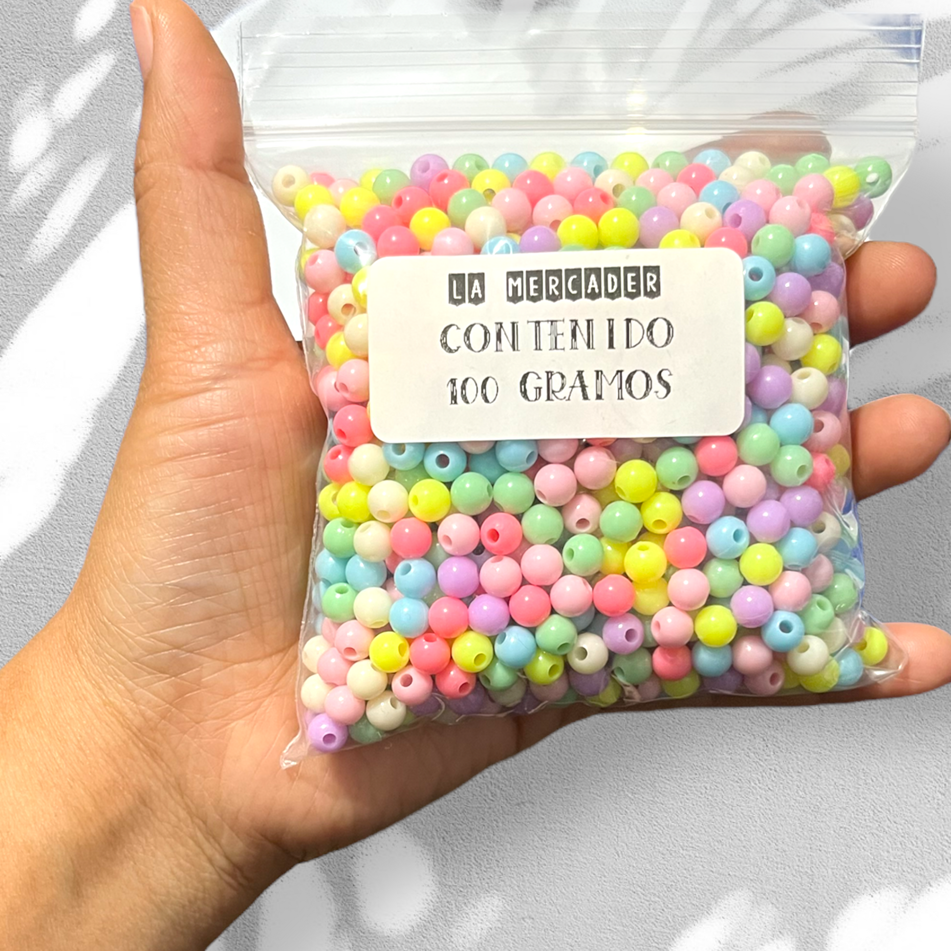 100 gramos de bolitas de colores pasteles mezclados, las bolitas tienen las siguientes medidas: