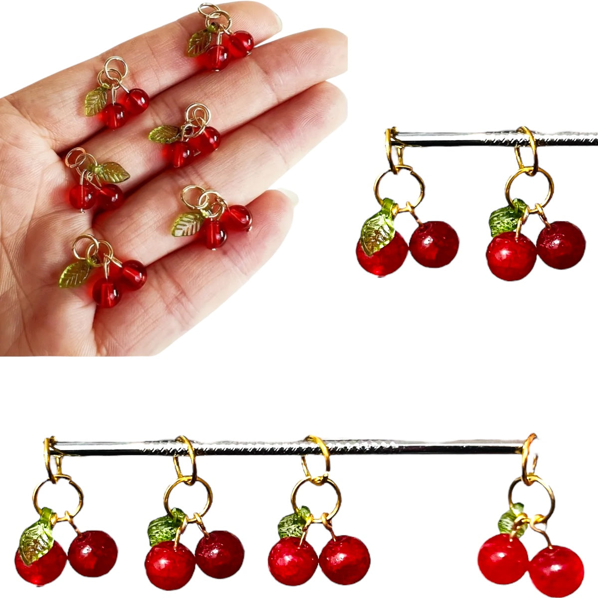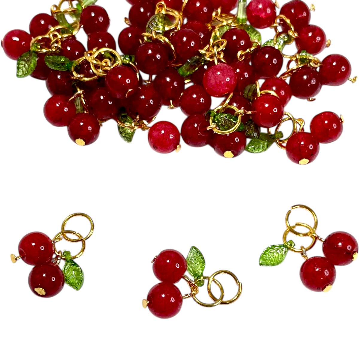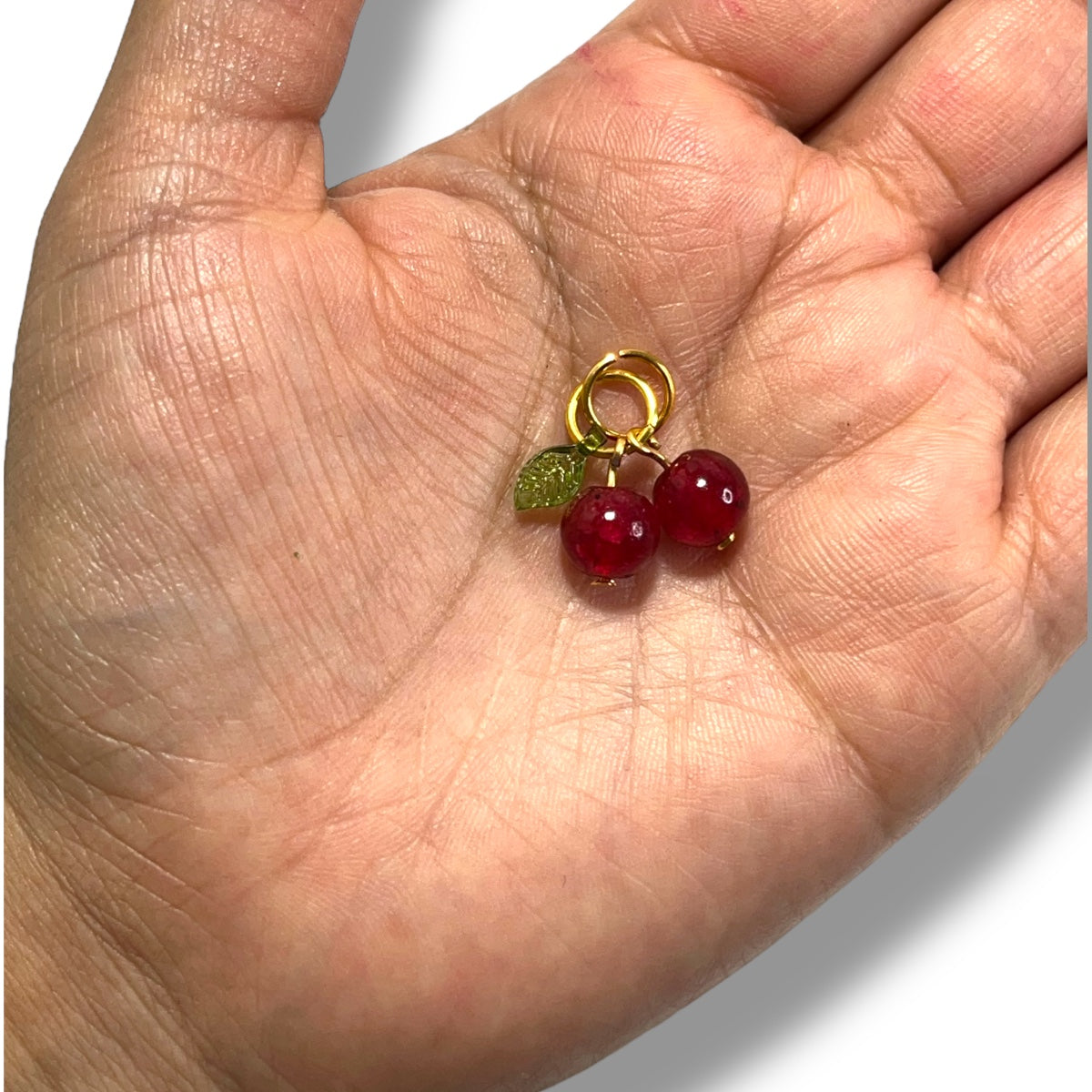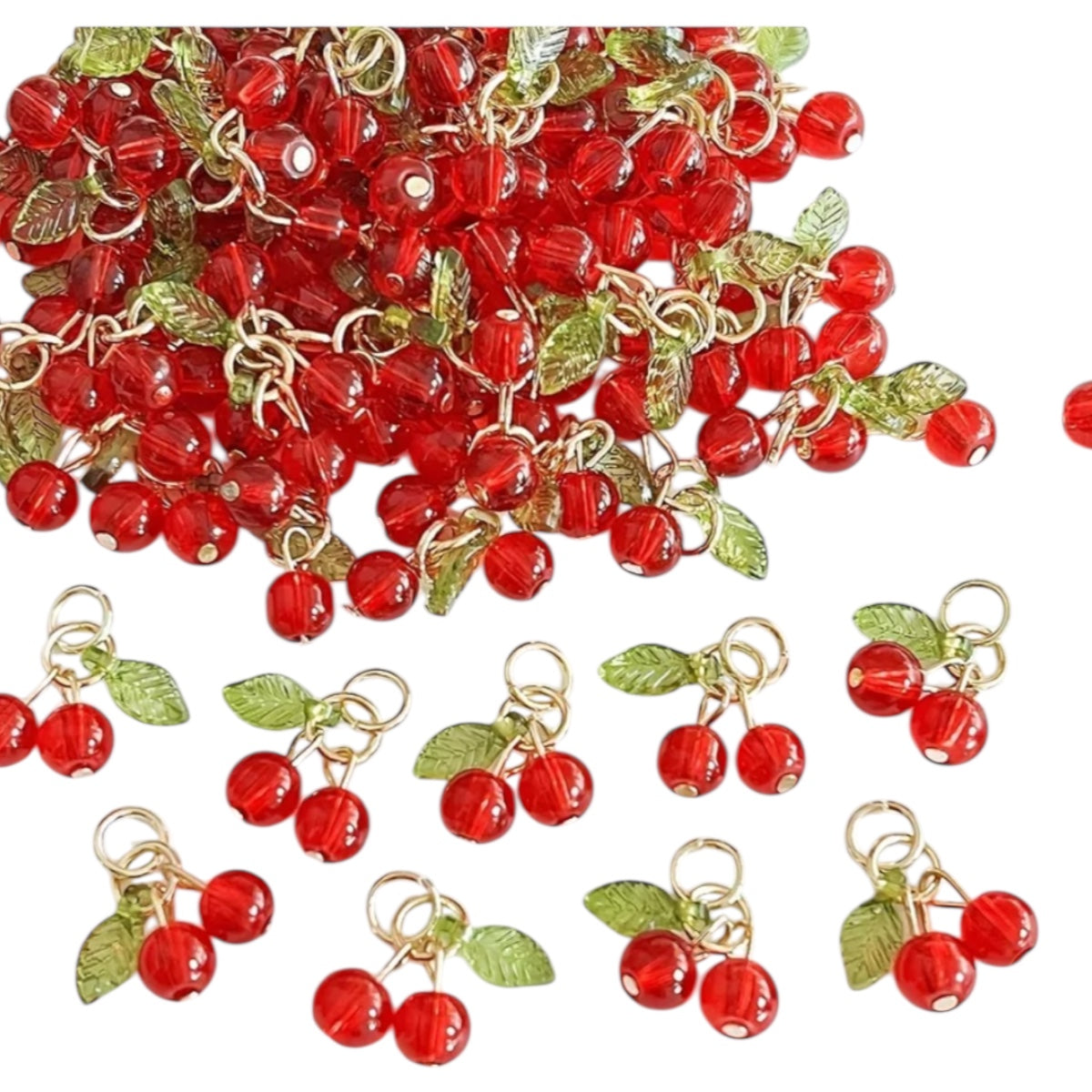 Dale un toque dulce y brillante a tus creaciones con este set de dijes en forma de cereza. Cada pieza está elaborada con cuentas de cristal rojo facetado, que reflejan la luz de forma encantadora. Incorporan una hoja verde en tono metálico y argollas doradas listas para usar en collares, pulseras, aretes o llaveros.