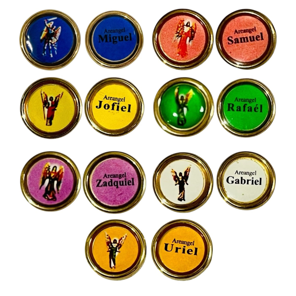 Este hermoso set incluye una pieza de cada uno de los 7 Arcángeles en acabado encapsulado brillante sobre plastimetal resistente. Cada dije es doble vista: