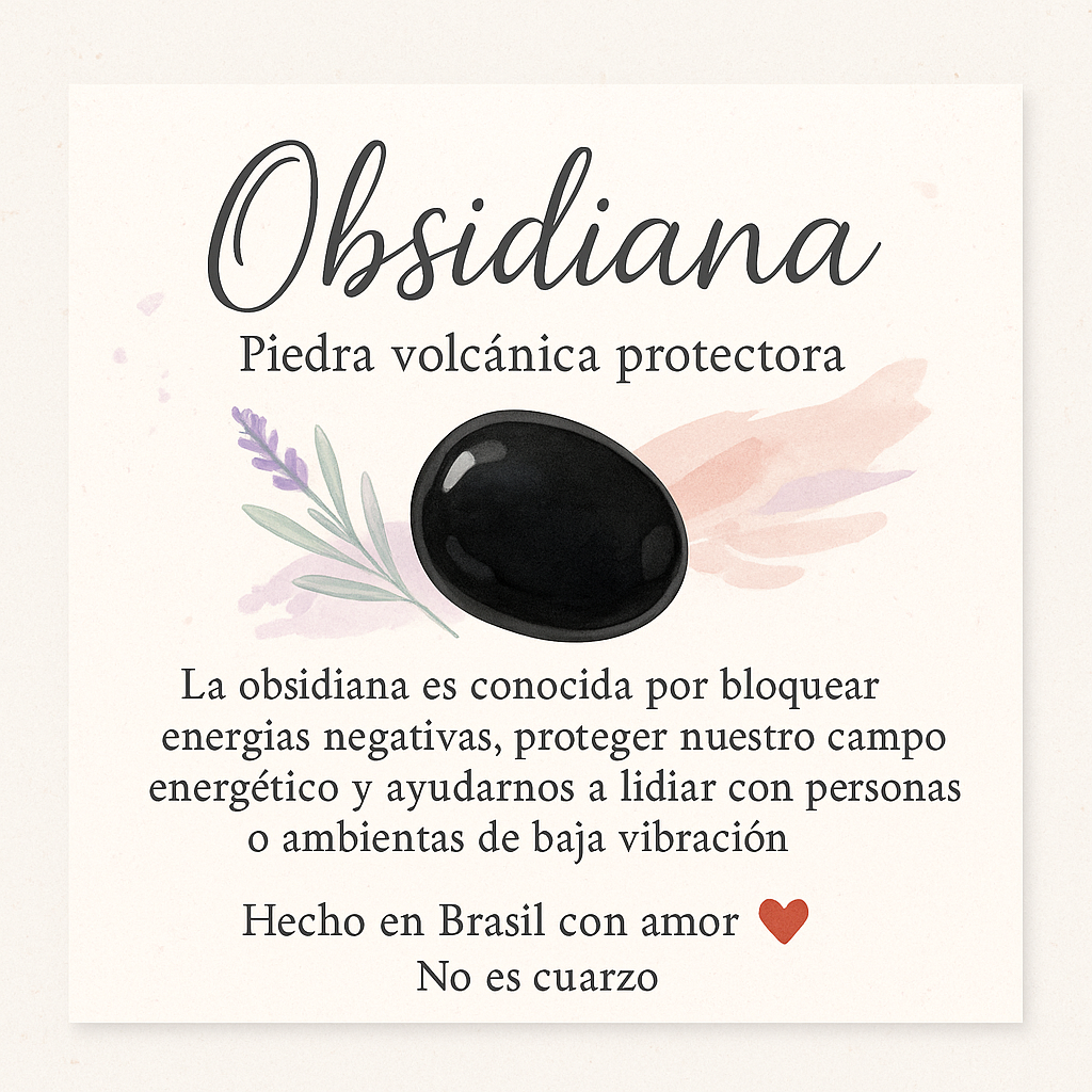 La obsidiana, piedra volcánica natural, actúa como escudo energético ayudando a bloquear influencias negativas, armonizar la energía interior y brindar sensación de seguridad emocional.