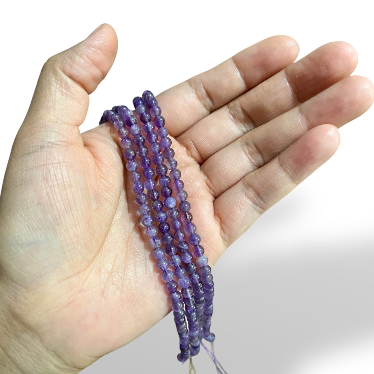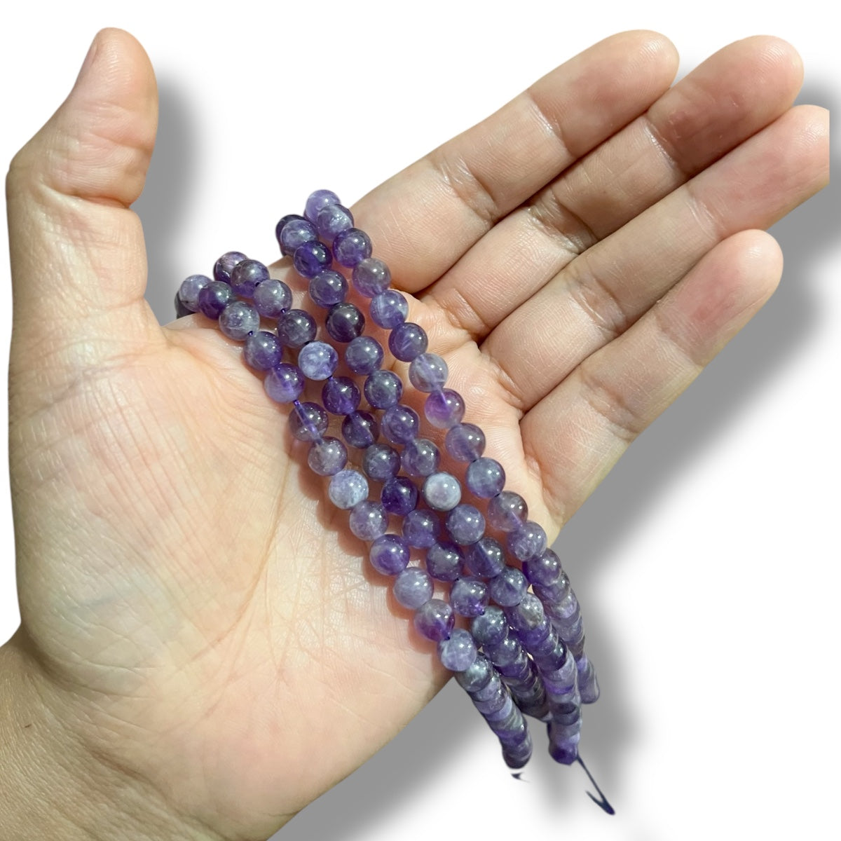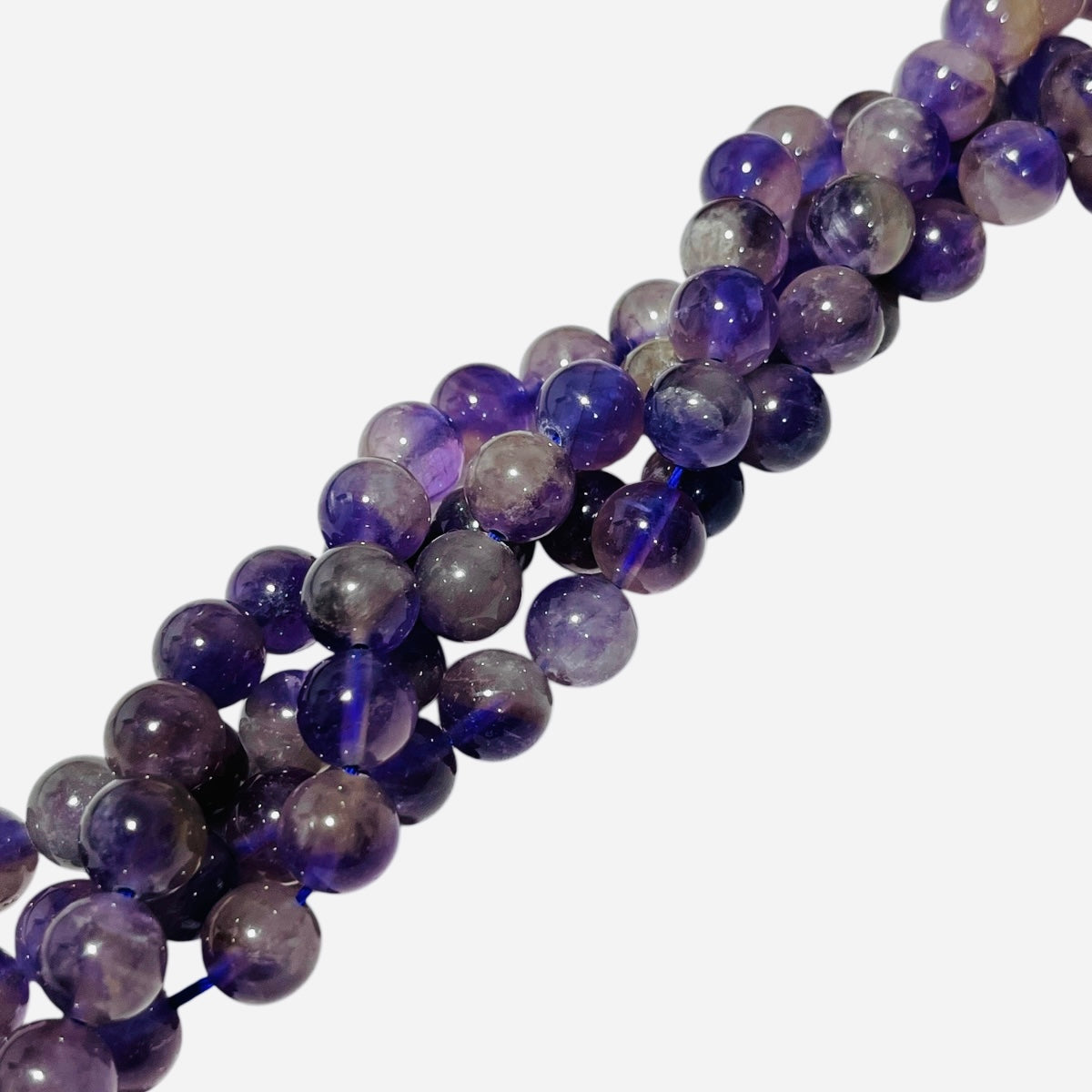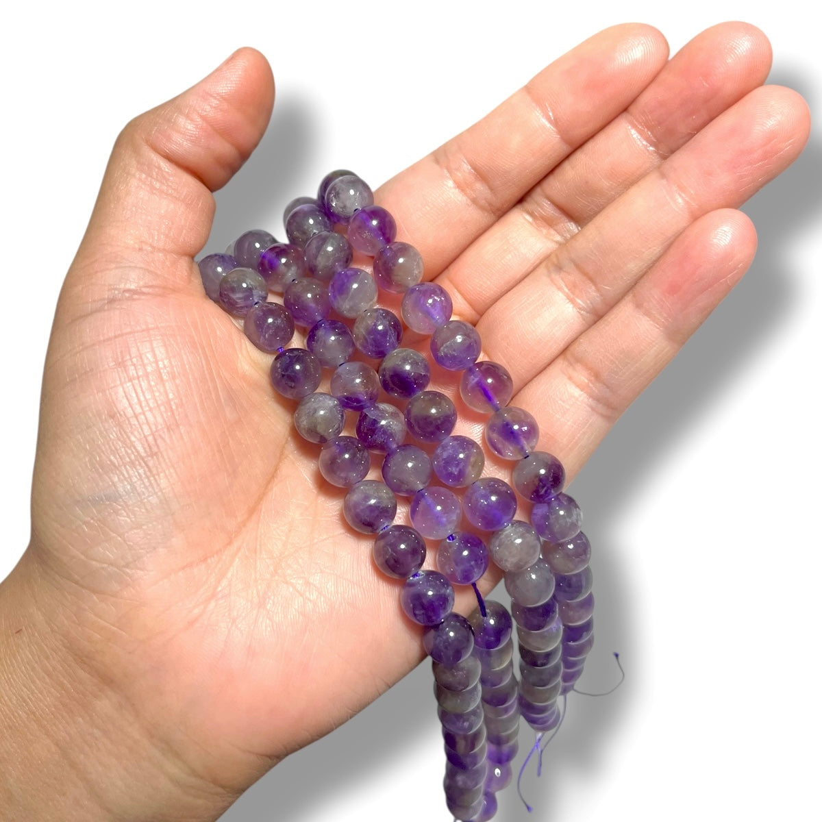 Cada cuenta presenta vetas y tonos morados característicos del cuarzo natural, ideal para pulseras, collares o amuletos.