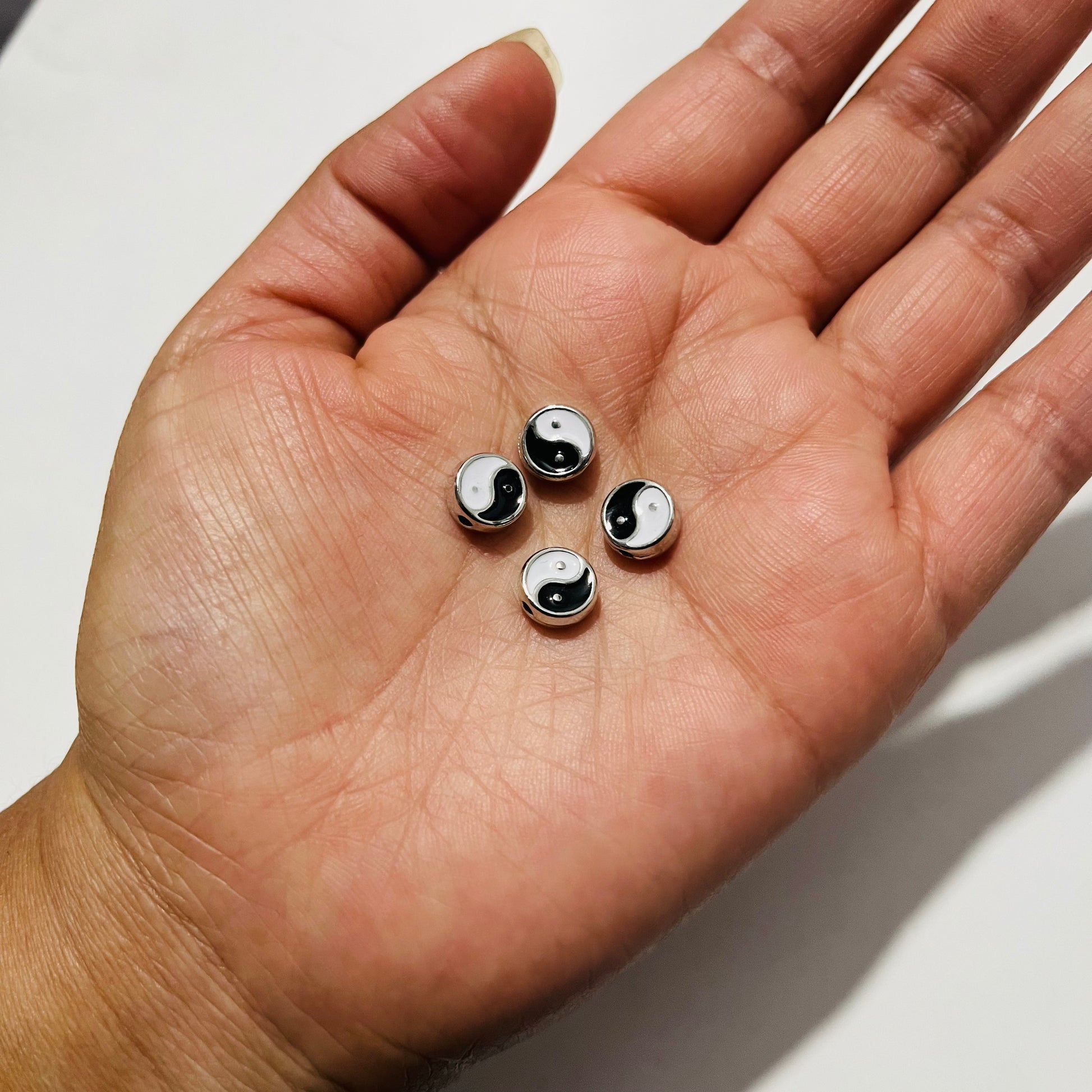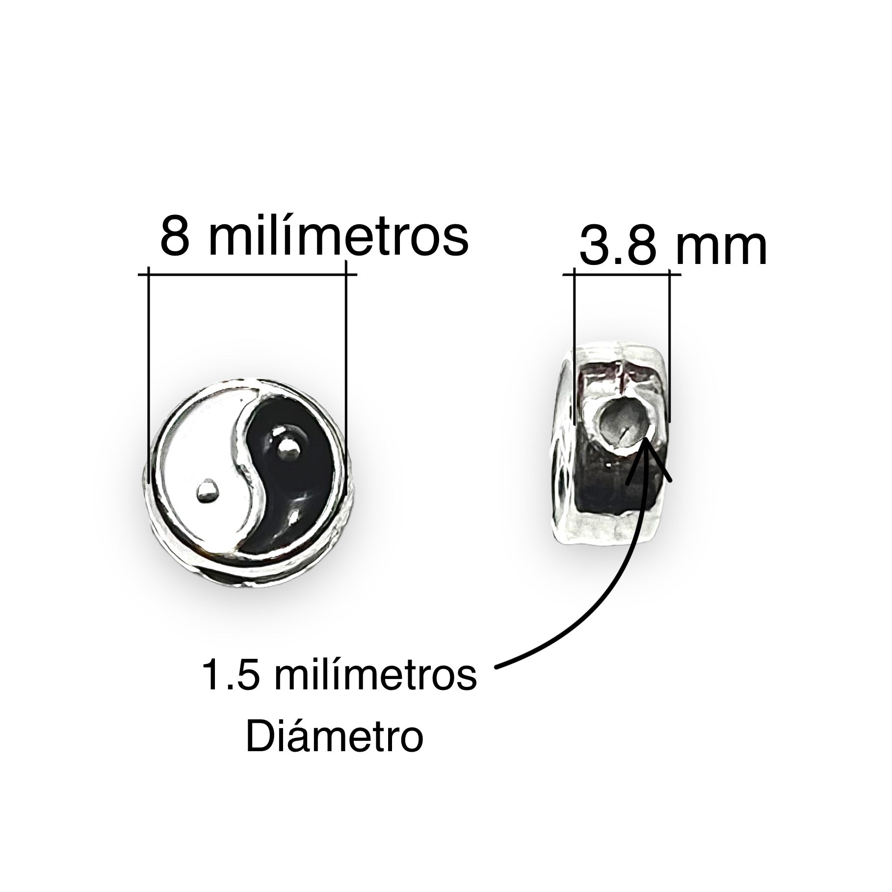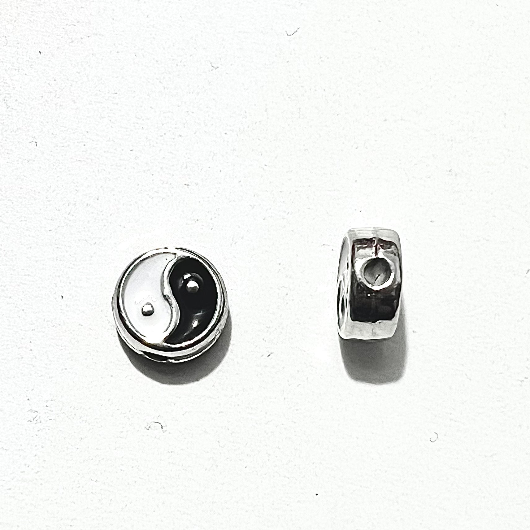 Yin y Yang dije de metal Esmaltado en 8 milímetros de diámetro con un espesor de 3.7 milímetros y un orificio transversal de 1.5 milímetros de diámetro ideal para hilos de calibre mediano a grueso